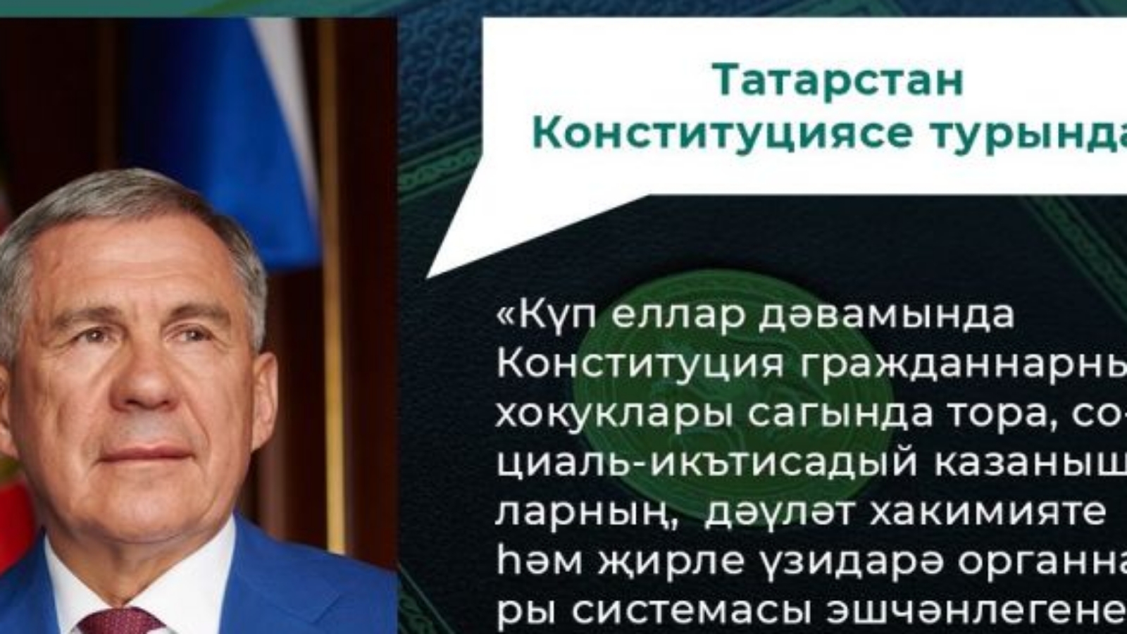 Конституция нормаларыннан тайпылмыйча, республиканың хәзергесе һәм киләчәге өчен шәхсән җаваплылык тоеп, без алга таба да Татарстанның үсешен, алгарышын, кешеләрнең тормышын яхшыртуны тәэмин итәрбез дип ышанам.