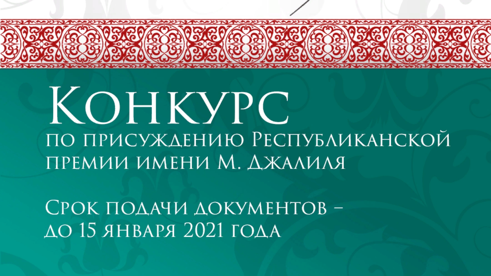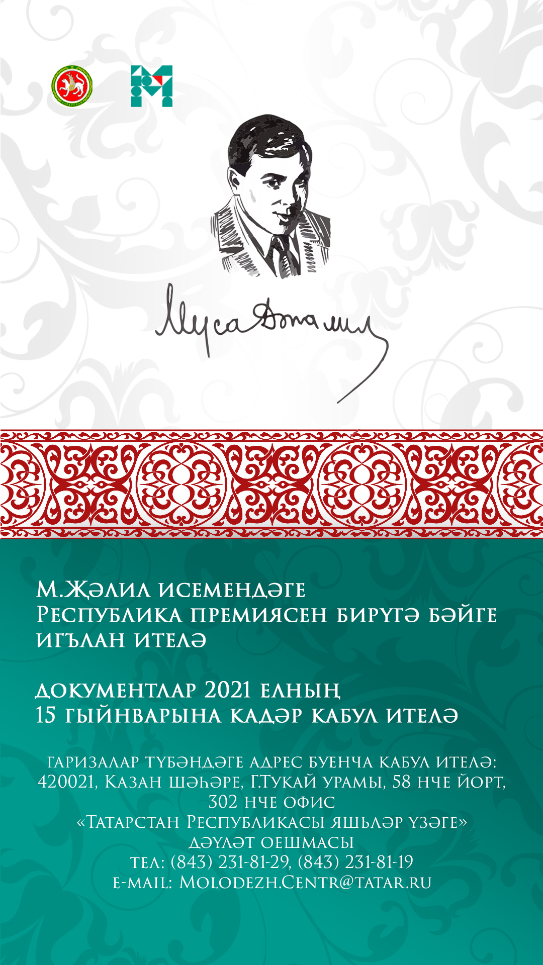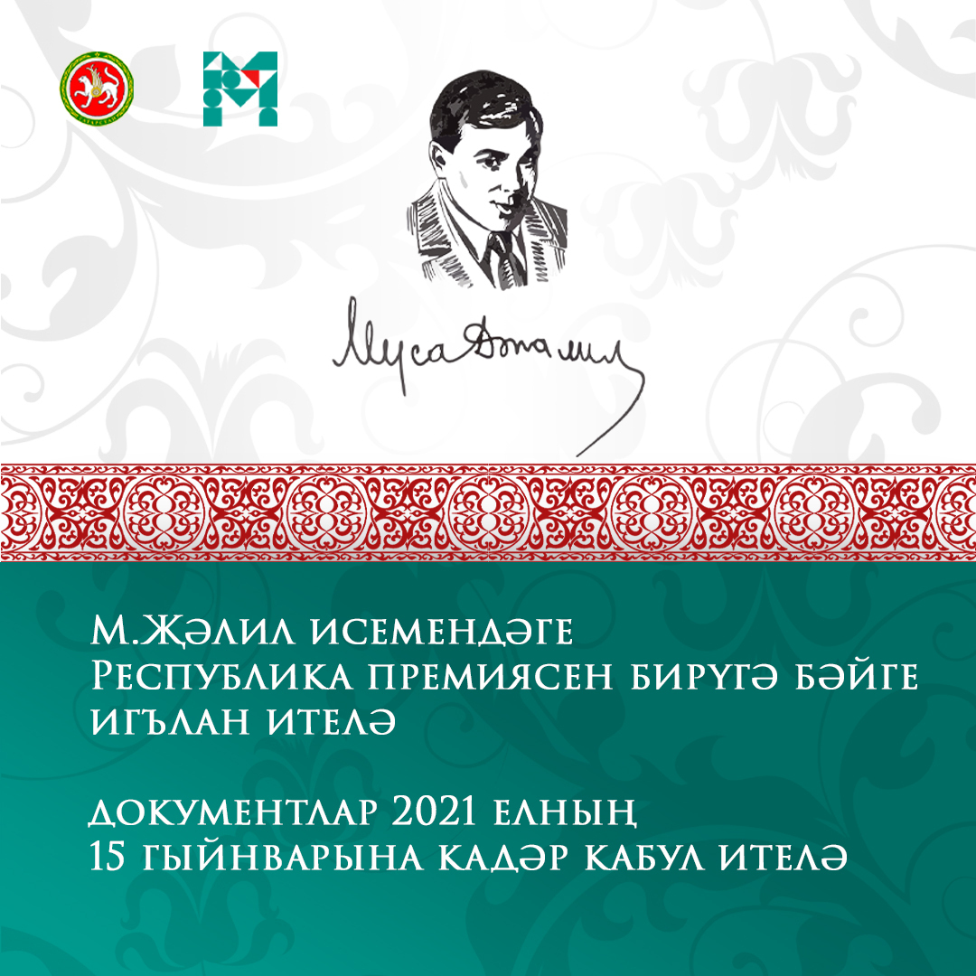 Татарстан Республикасы Яшьләр эшләре һәм спорт министрлыгы тарафыннан 2020 – 2021 елларга.М. Җәлил исемендәге республика премиясен бирү буенча конкурска гаризалар кабул ителә башлады.