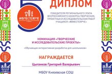 «#ВМЕСТЯРЧЕ» «Мәктәп укучылары өчен интерактив эшләнмә»Бөтенроссия укучыларның иҗади, проект һәм тикшеренү эшләре конкурсының региональ этабында Кнәз мәктәбе укучысы Цыганков Григорий «Иҗади һәм тикшеренү проектлары» номинациясендә җиңүче булды. Григорий һәм җитәкче Л.М. Ерхованы җиңүләре белән котлыйбыз!