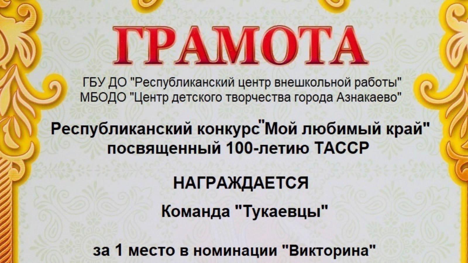 Тукай муниципаль районы Мусабай-Завод урта мәктәбе командасы( Петрова Аделина, Шайхиев Айбулат, Зарипов Ислам, Ризванова Регина составында), өстәмә белем бирү педагогы Хәмидуллина М. Н. җитәкчелегендә, ТАССРның 100 еллыгына багышланган «Минем яраткан ягым» республика конкурсында «Викторина " номинациясендә җиңүче булды
