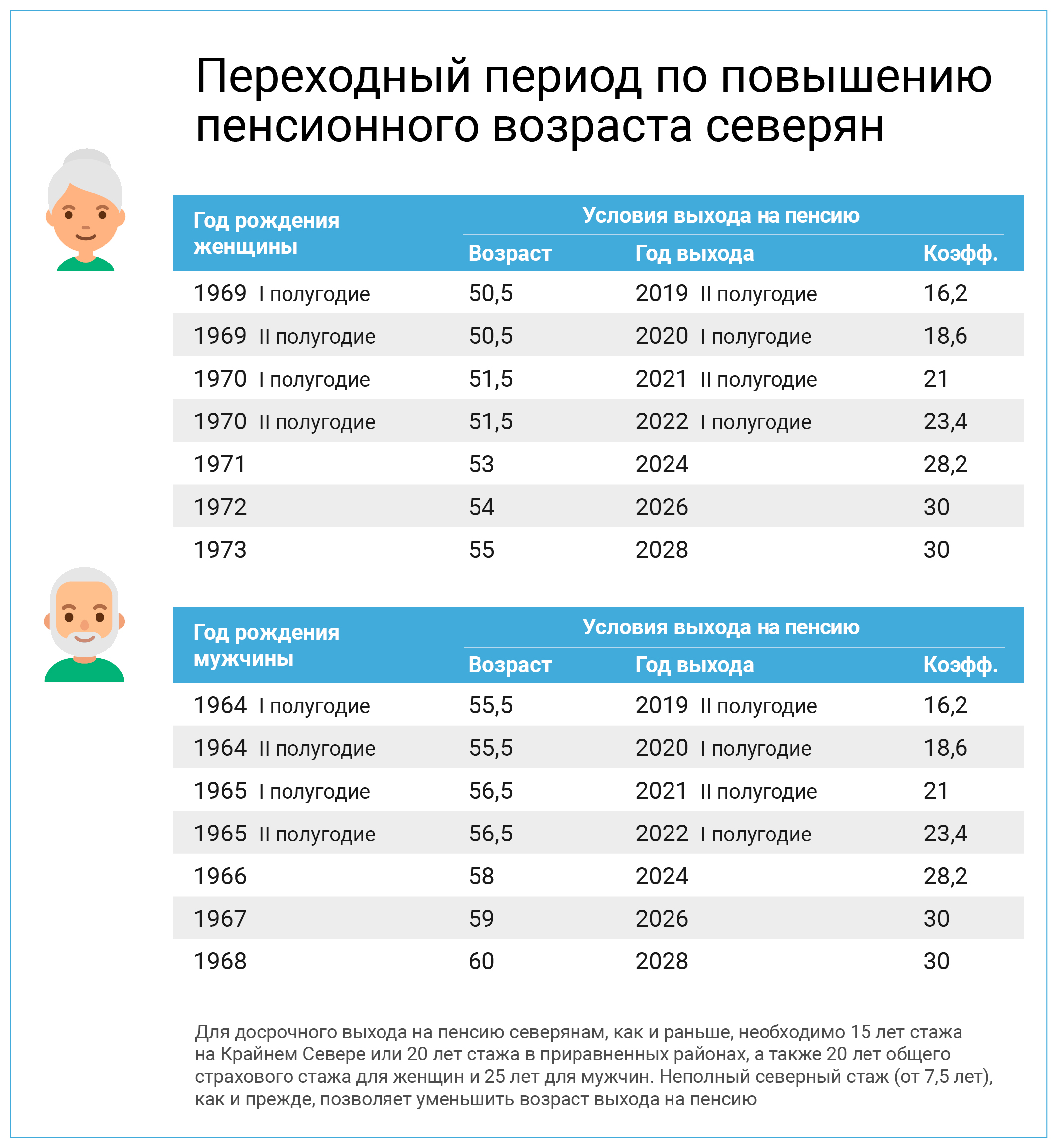 Төньякта яшәүчеләр быел да пенсиягә гомуми пенсия стажы туплаганчы 5 ел алда, ләкин күчеш чоры гагыйдәләре кысаларында чыгачак. Вакытыннан алда пенсия билгеләү өчен минималь төньяк стажы үзгәрешсез калды һәм Ерак төньяк өчен – 15, аңа тигезләштерелгән районнарда яшәүчеләргә 20 календарь ел тәшкил итә. Гомуми иминият стажы да шул күләмдә һәм хатын-кызларга – 20, ир-атлар өчен 25 ел кала.