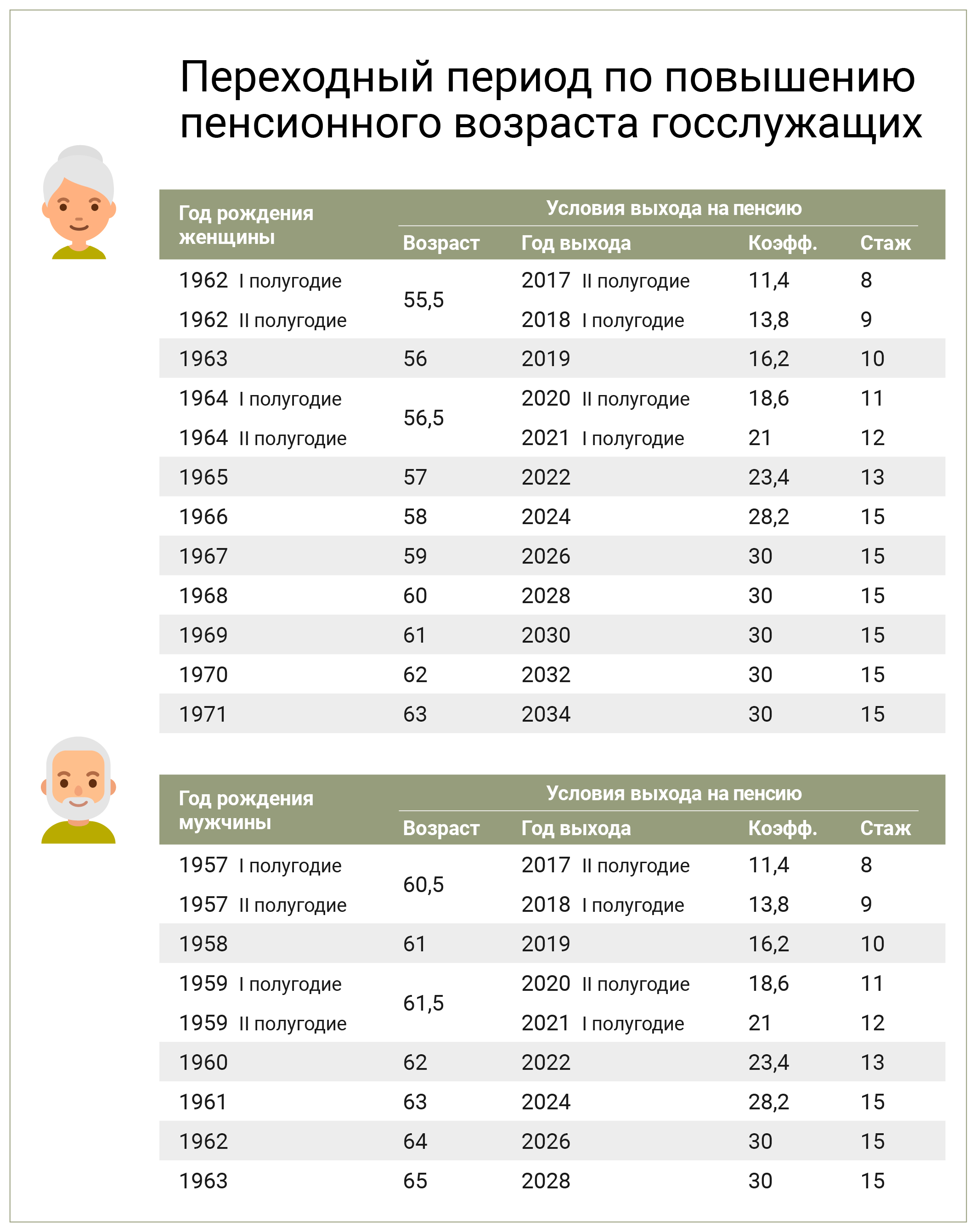 Әлеге мөмкинлекне 2020 елда пенсиягә чыгарга тиеш булган гражданнар өчен каралган махсус ташлама бирә. 1965 елда туган хаты-кызлар һәм 1960 елда туган ир-атлар, туган көннәре елның беренче яисә икенче яртысына туры килүгә карап, пенсиягә 2021 елның икенче яртысында яки 2022 елның беренче яртысында чыгачаклар. Элеккеге пенсия яшенә быел җитүчеләргә күчеш чоры кагыйдәләре кысаларында пенсия 2024 елда билгеләнәчәк.