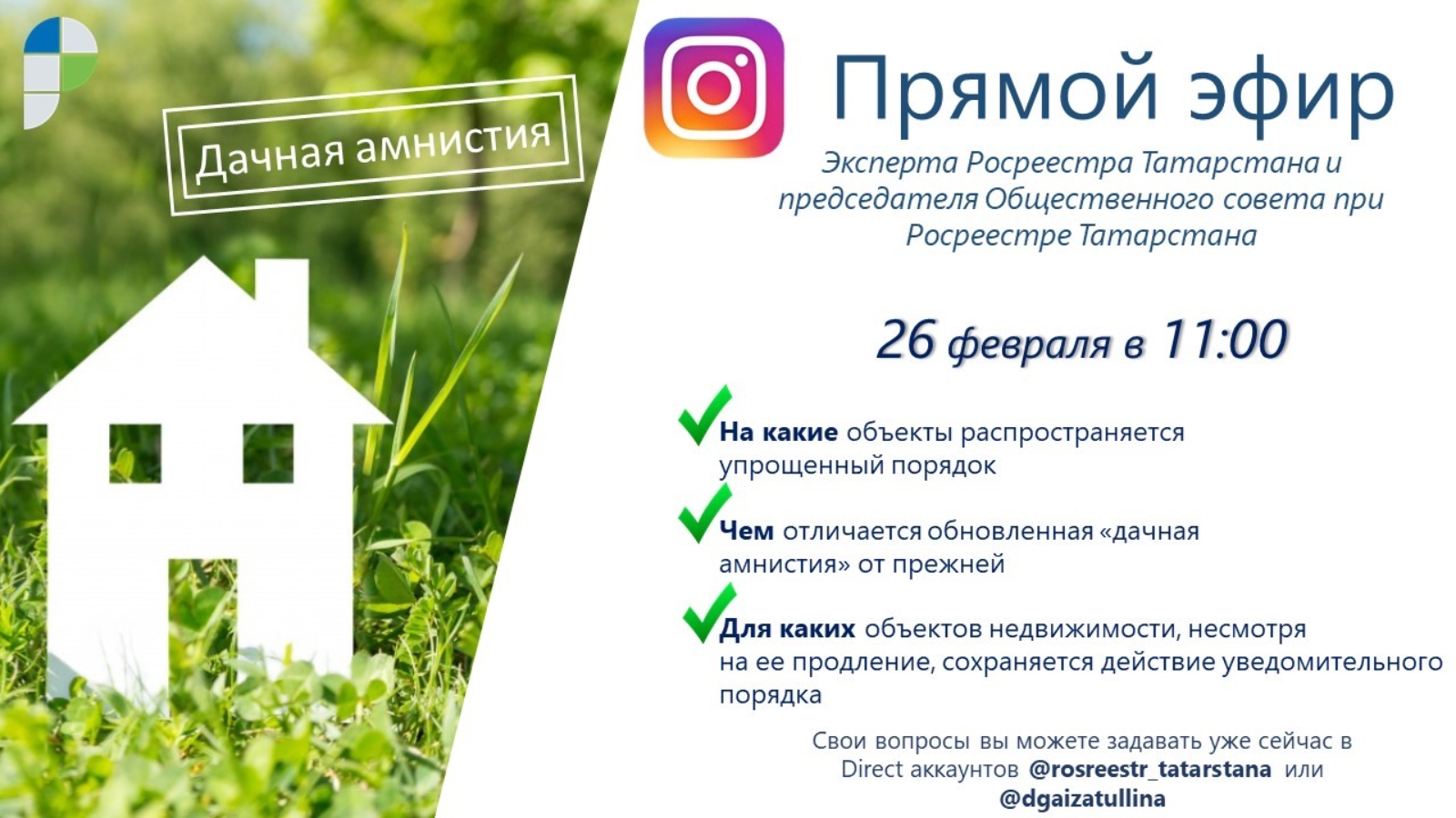 Тиздән дача сезоны башлана, һәм күп кенә татарстанлылар өчен шәһәр читендәге күчемсез милекне сату-алу яки аны милеккә рәсмиләштерү мәсьәләләре беркайчан да актуаль булачак. Шуңа күрә дача сезоны алдыннан инстаграмда Татарстан Росреестры эксперты Энҗе Мөхәммәтгалиева һәм Татарстан Росреестры каршындагы Иҗтимагый совет рәисе Динә Гайзатуллина катнашында турыдан-туры эфир үткәчәк .