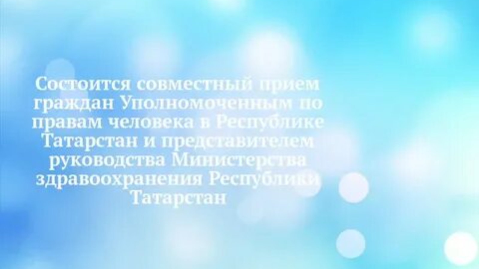 2021 елның 16 мартында 14.00 сәгатьтән 16.00 сәгатькә кадәр Татарстан Республикасында Кеше хокуклары буенча вәкаләтле вәкил Аппаратында (Казан шәһәре, Карл Маркс ур., 61 нче йорт) Татарстан Республикасында Кеше хокуклары буенча вәкаләтле вәкил һәм Татарстан Республикасы Сәламәтлек саклау министрлыгы җитәкчелеге вәкиленең гражданнарны бергәләп кабул итүе була