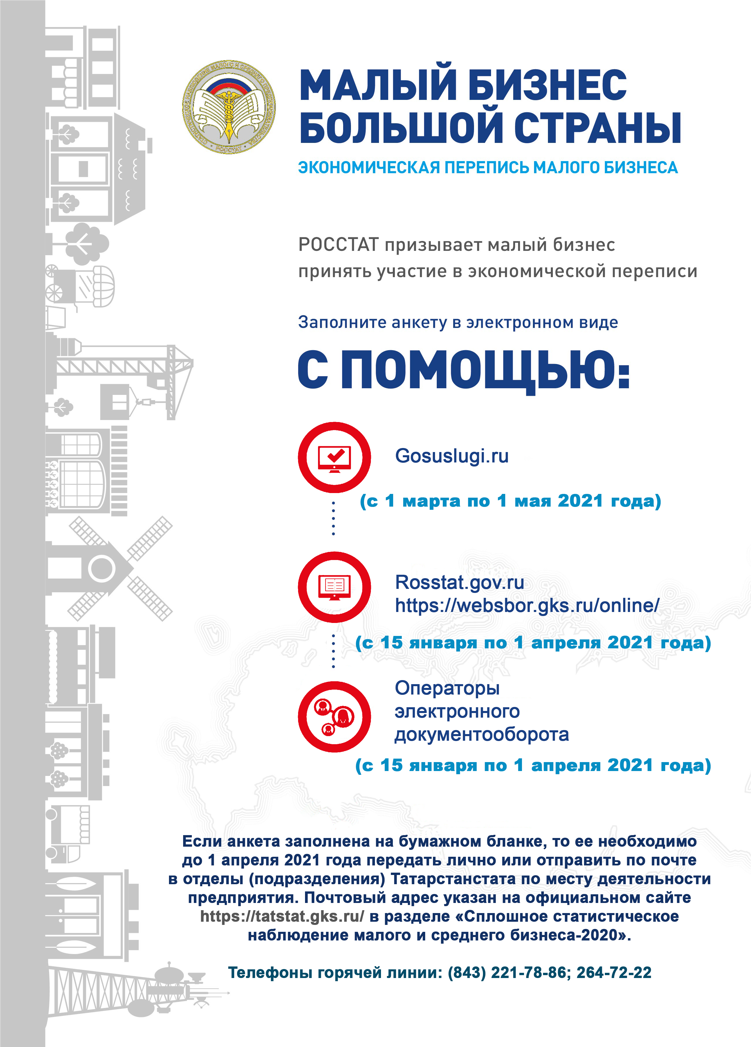 Шулай ук тутырылган бланкны кәгазьдә 2021 елның 1 апреленә кадәр эшчәнлек алып бару урыны буенча Дәүләт статистикасы органына шәхсән яки почта аша җибәрү мөмкинлеге сакланган.
