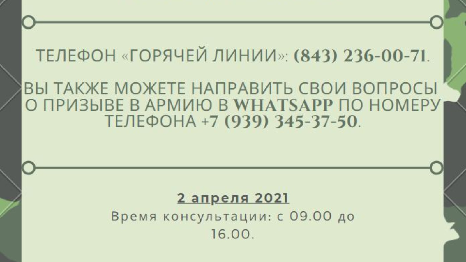 Сез шулай ук армиягә чакыруга кагылышлы сорауларыгызны WhatsApp телефон +7 (939) 345-37-50 номеры буенча җибәрә аласыз.