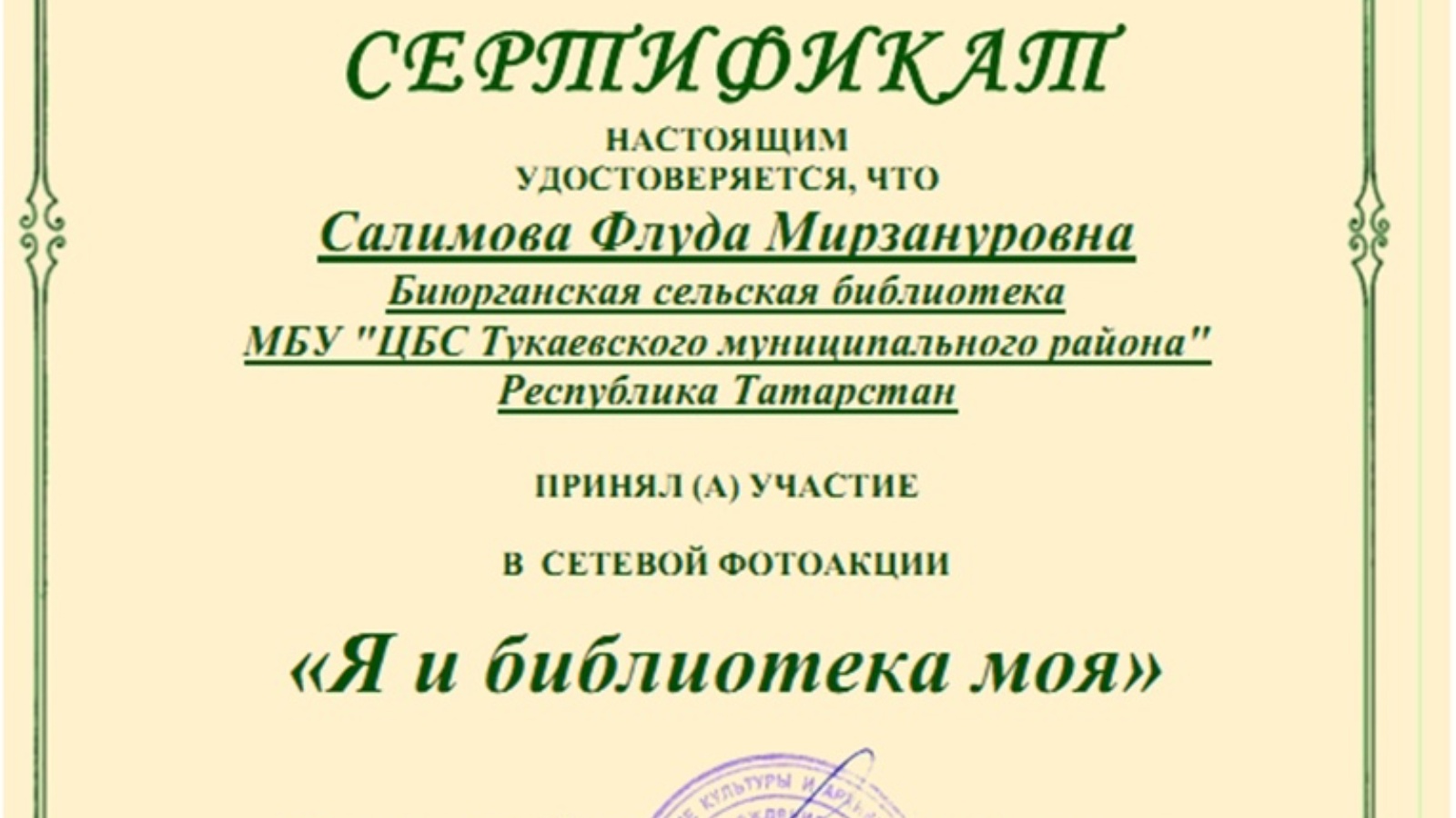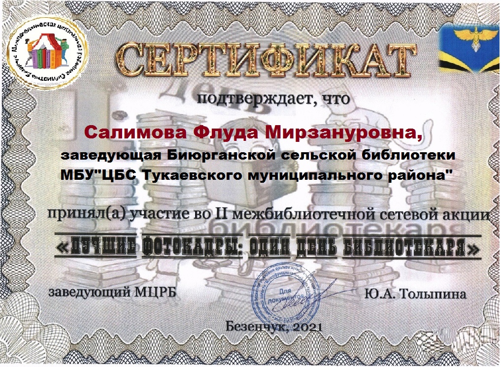 Татарстан Республикасы Тукай муниципаль районы Боерган авыл китапханәсенең 23 нче филиалы мөдире Флүдә Мирзанур кызы Сәлимова район чараларында актив катнаша,аның уңышлары Татарстан Республикасы масштабында гына түгел,башка төбәкләрдә дә билгеле.