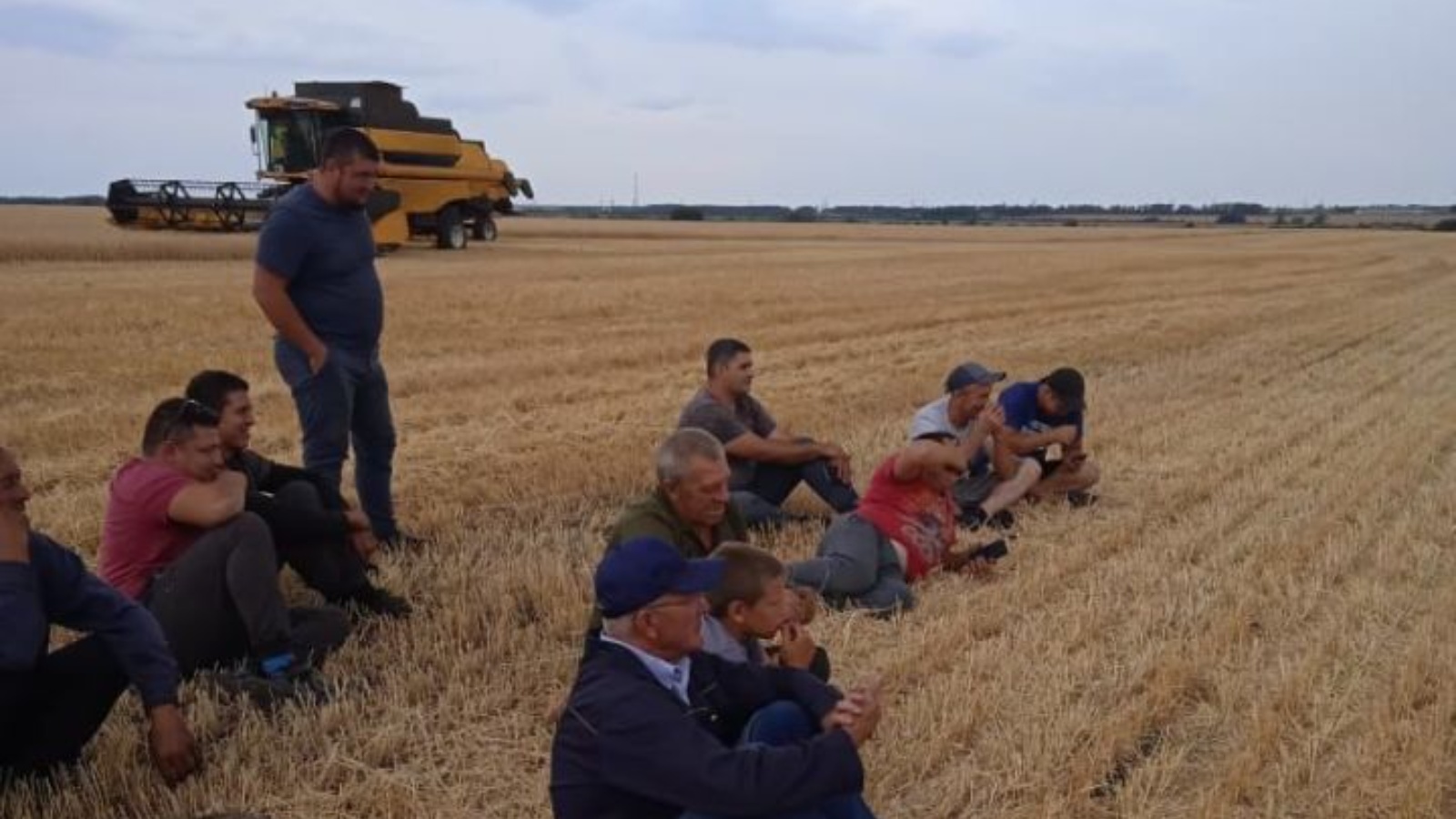 Анда безне агроном Сергей Волков каршы алды. Комбайнчыларның нәкъ көндезге ашауларын тәмамлаган чагы иде. Менә алар җайлап кына үлән өстенә утырдылар һәм без чыгышыбызны башладык.