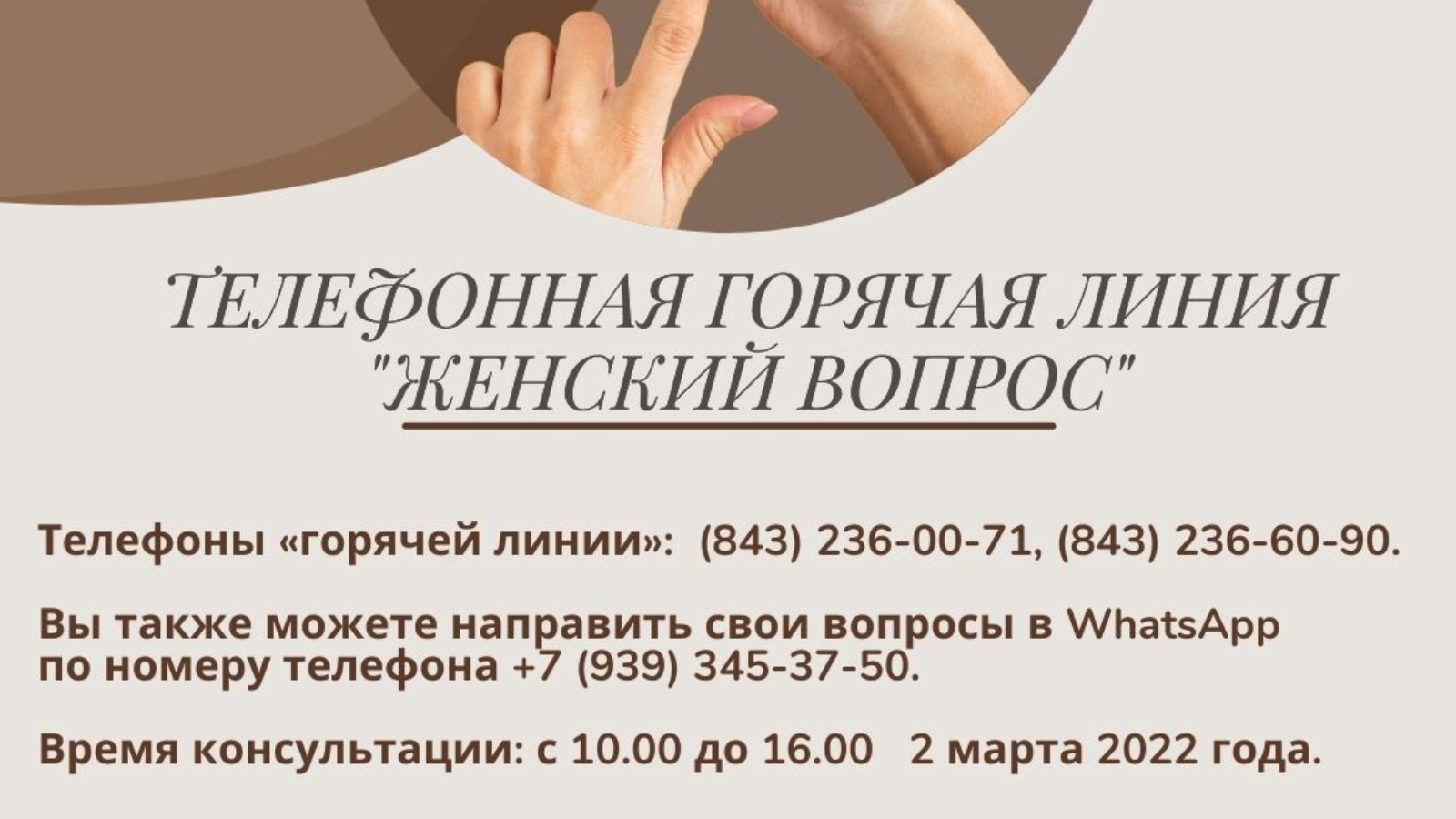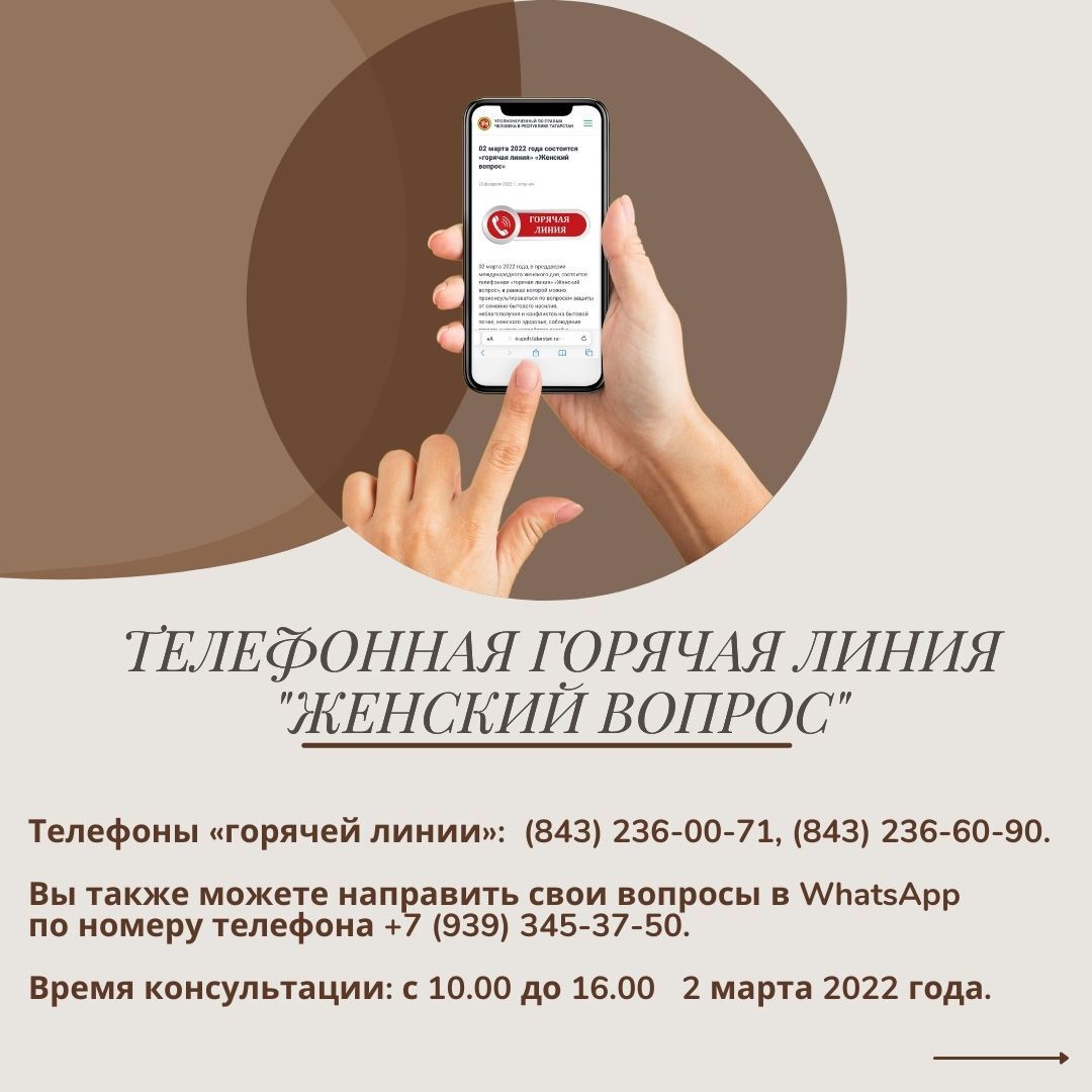2022 елның 2 мартында, Халыкара хатын-кызлар көне алдыннан, гаилә-көнкүреш көч кулланудан, тормыш-көнкүреш нигезендә Имин булмаган һәм конфликтлардан, хатын-кызлар сәламәтлегеннән яклау, хезмәт хокукларын үтәү, балаларны белем бирү учреждениеләренә урнаштыру, балалы гаиләләрне социаль яклау һәм социаль тәэмин итү, торак-коммуналь хуҗалык мәсьәләләре буенча «Хатын-кызлар соравы» телефон аша «кайнар линия» үткәрелә