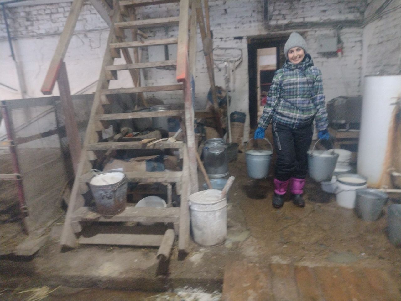 Бу эшне тәмамлагач та, Люда ханым белән сөттән бушап калган чиләкләрне юабыз, кайнар су белән пешекли-пешекли чайкап, аларны махсус киштәләргә киптерергә тезәбез.