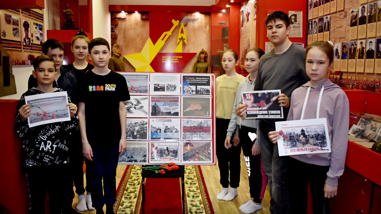 Балаларга 11 апрельдә Халыкара концлагерь тоткыннарын азат итү көне билгеләп үтелүе турында сөйләделәр. Күрсәтелгән презентациядән алар Бухенвальд, Дахау, Мәйданек, Освенцим һ.б. лагерьлары, фашистлар өлкәннәр һәм балалар өстендә кылган җәнлекләр турында белделәр. Фашист концлагерьларында һәлак булган тоткыннарны бер минут тынлык белән искә алдылар. «Родина» патриотик клубы әгъзалары үз куллары белән ясалган чәчәкләр салдылар, Хәтер шәмнәрен кабыздылар.