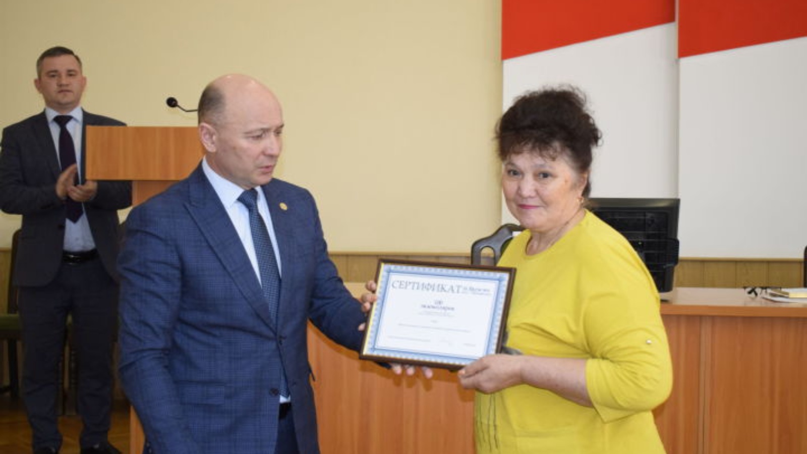 Район хакимияте утырышлар залында район башлыгы Фаил Камаев районның ветераннар советы һәм инвалидлар җәмгыяте рәисе Фәйрүзә Вәҗиевага «Якты юл» («Светлый путь») газетасына 100 кешене яздыру өчен сертификат тапшырды.