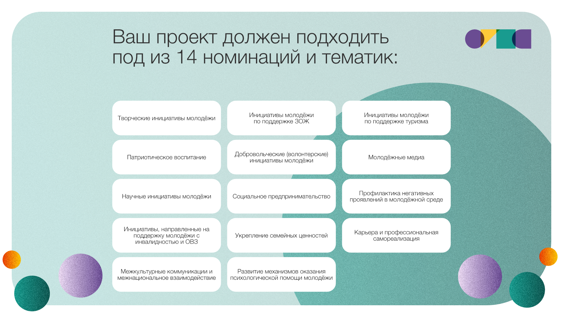 Быел конкурс 14 номинация буенча үткәрелә. Алар арасында - «Яшьләрнең иҗади инициативалары», «Яшьләрнең сәламәтлекләренә ярдәм итү буенча инициативалары», «Туризмга ярдәм итү буенча яшьләр инициативалары», "Патриотик тәрбия", "Яшьләрнең ирекле (волонтерлык) инициативалары", "Яшьләр медиасы", "Яшьләрнең фәнни инициативалары" һ.б.лар.