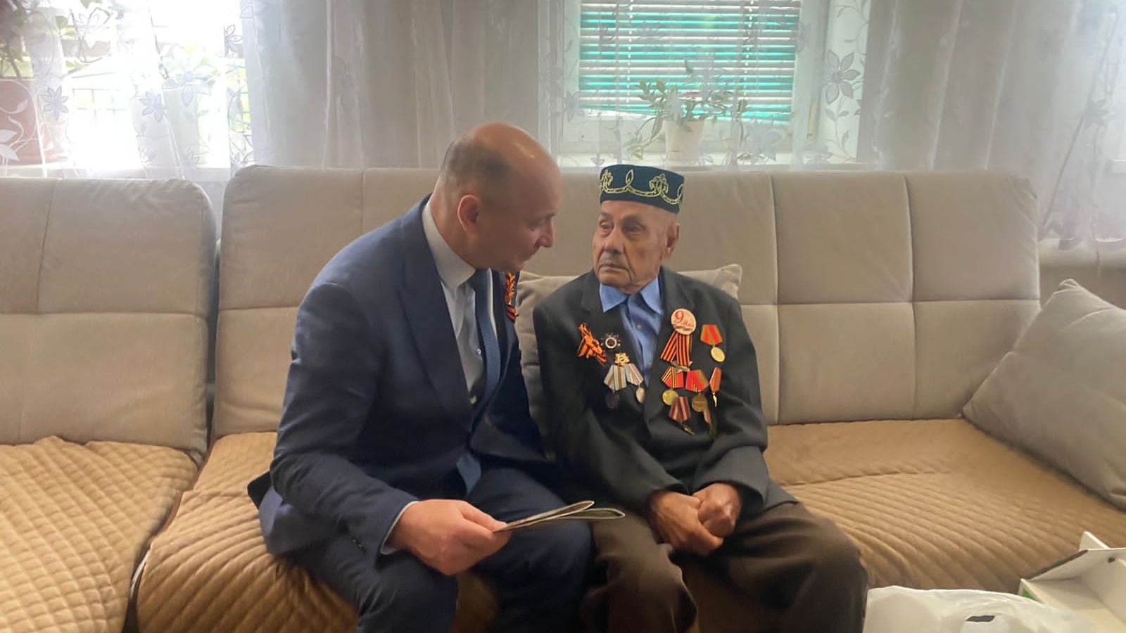 Шуларның берсе,Нуриев Рафкат Тахаветдинович . Фаил Мисбах улы ветеран белән әңгәмә корды, хәлләрен белеште, якынлашып килүче бәйрәм - Бөек Җиңүнең 77 еллыгы белән котлады, бүләкләр тапшырды.