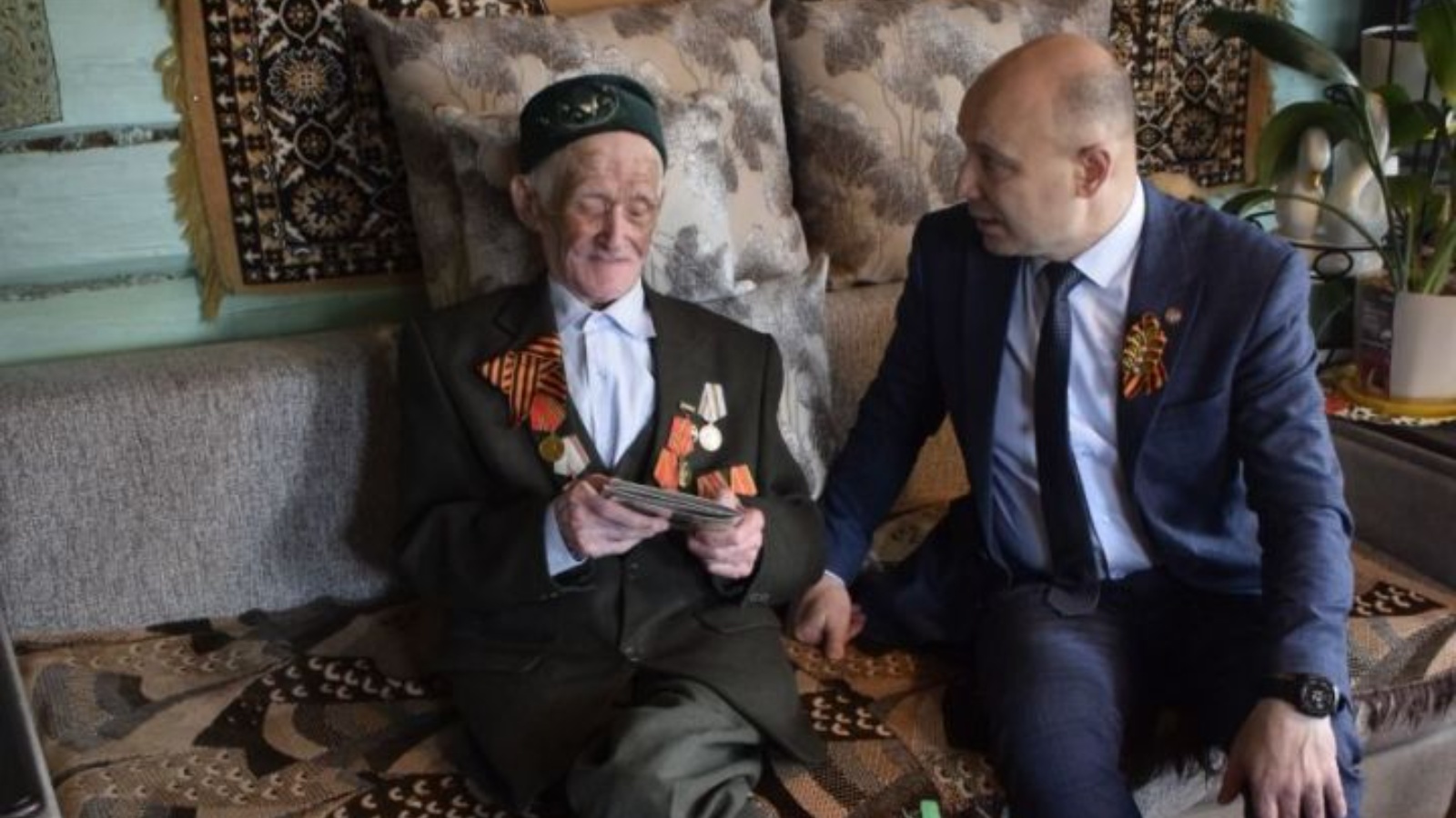Вставка 2: 95 яшьлек сугыш ветераны Мәхмүтҗан Сабиров җурналистларның сорауларына җавап бирә алмаса да, район башлыгы Фаил Мисбаховичны күргәч тә ничектер үсенеп китә. Ул аңа газета укырга яратуы турында да сөйли, үзен борчыган сорауларны да бирә.