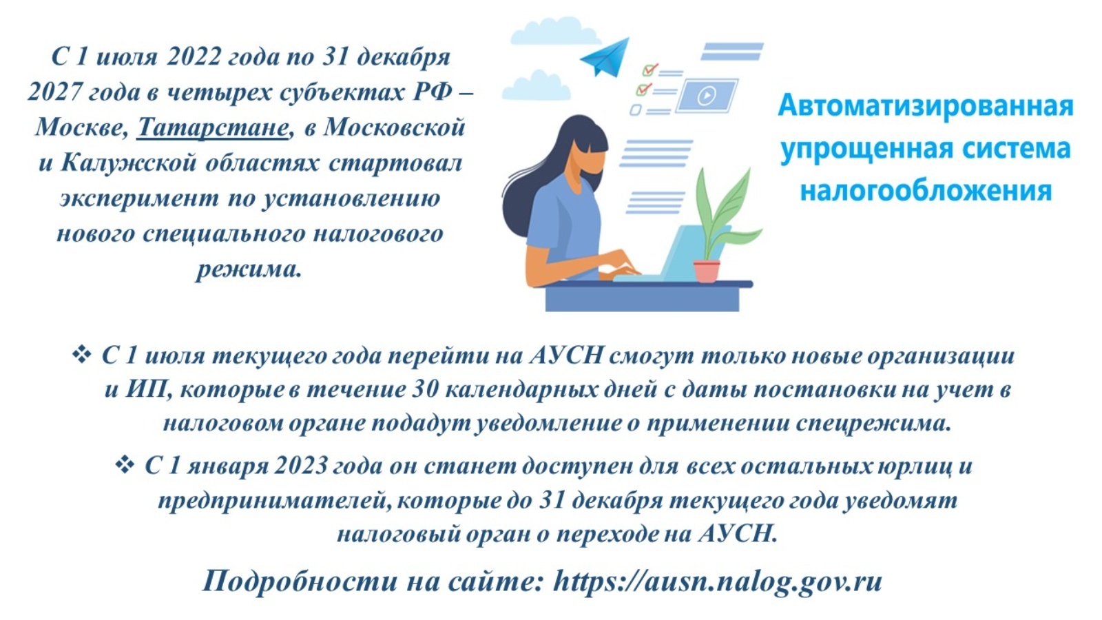 2022 елның 1 июлендә Татарстан Республикасында яңа махсус салым режимын кертү буенча эксперимент башланды-салым салуның автоматлаштырылган гадиләштерелгән системасы (АУСН), ул салым түләүче өчен кассалардан һәм банк счетларыннан салымнарны тулысынча исәпләргә мөмкинлек бирә.
