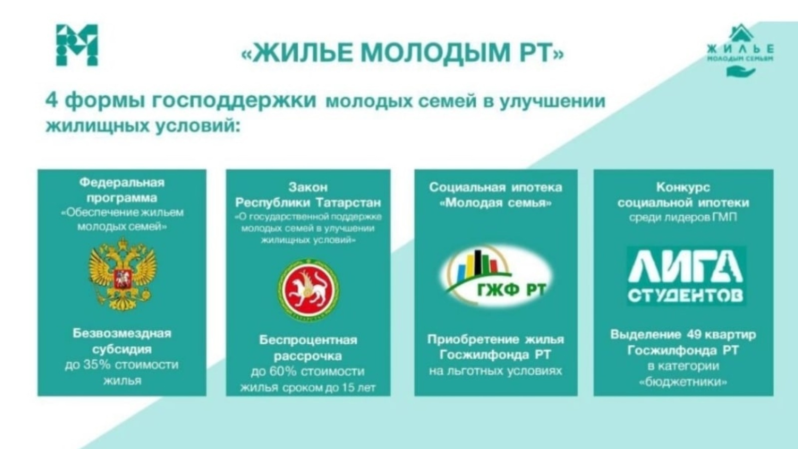 Татарстан Дәүләт торак фондының ташламалы социаль ипотека шартларында «яшь гаилә» программасы; Республика яшьләр торак конкурсы (ТР Студентлар лигасы).