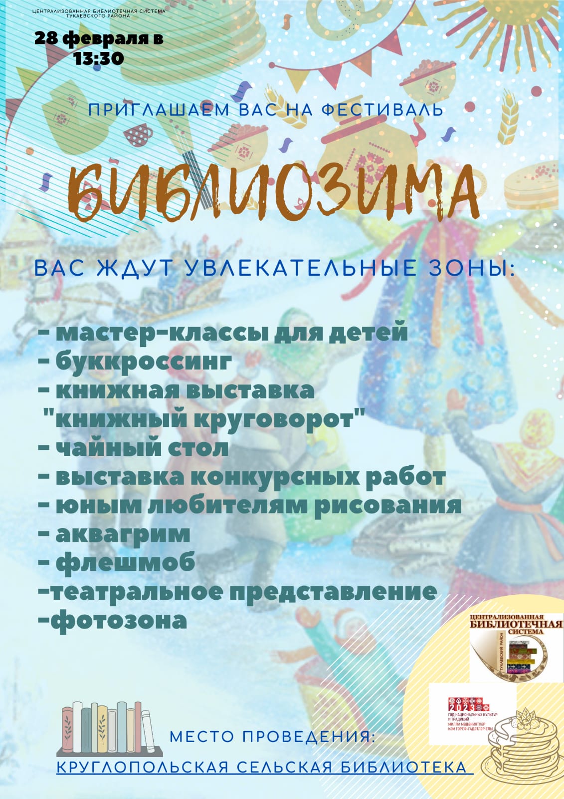Тукай муниципаль районы Үзәкләштерелгән китапханәләр системасы муниципаль бюджет учреждениесе 28 февраль көнне Круглое Поле авыл җирлеге китапханәсендә 13 :30 минутта узачак "Библиозима" фестиваленә чакыра