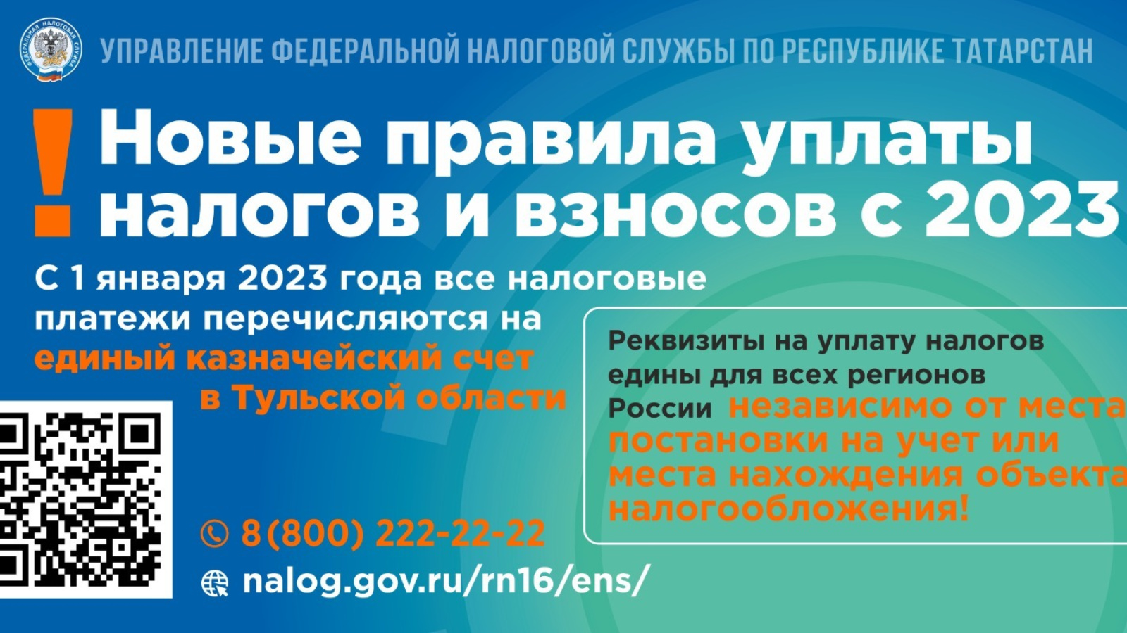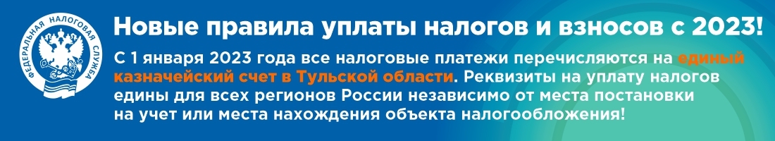 2023 елдан салымнар һәм взнослар түләүнең яңа кагыйдәләренә күчү турында, аерым алганда, Тула өлкәсендәге бердәм казначылык счетына күчү турында киң даирә затларга Татарстан Республикасы буенча Россия Федераль салым хезмәтенең Татарстан Республикасы буенча идарәсенең хатын (алга таба - идарә) үтәү максатында Татарстан Республикасы буенча 9 нчы районара ИФНС баннер макетын җибәрә.