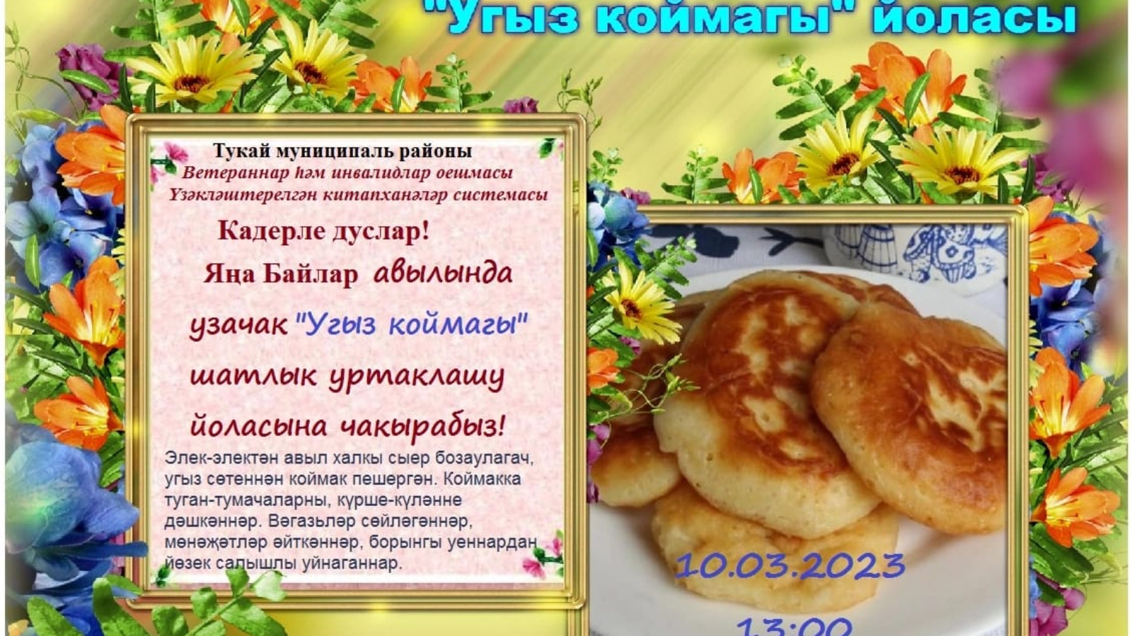 10 март көнне ,Тукай районы ветераннар( инвалидлар) оешмасы ,районның Үзәкләштерелгән китапханәләр системасы , Яна Байлар авылында 13 :00 сәгатьтә узачак "Угыз коймагы" дигән йола кичәсенә чакыра.