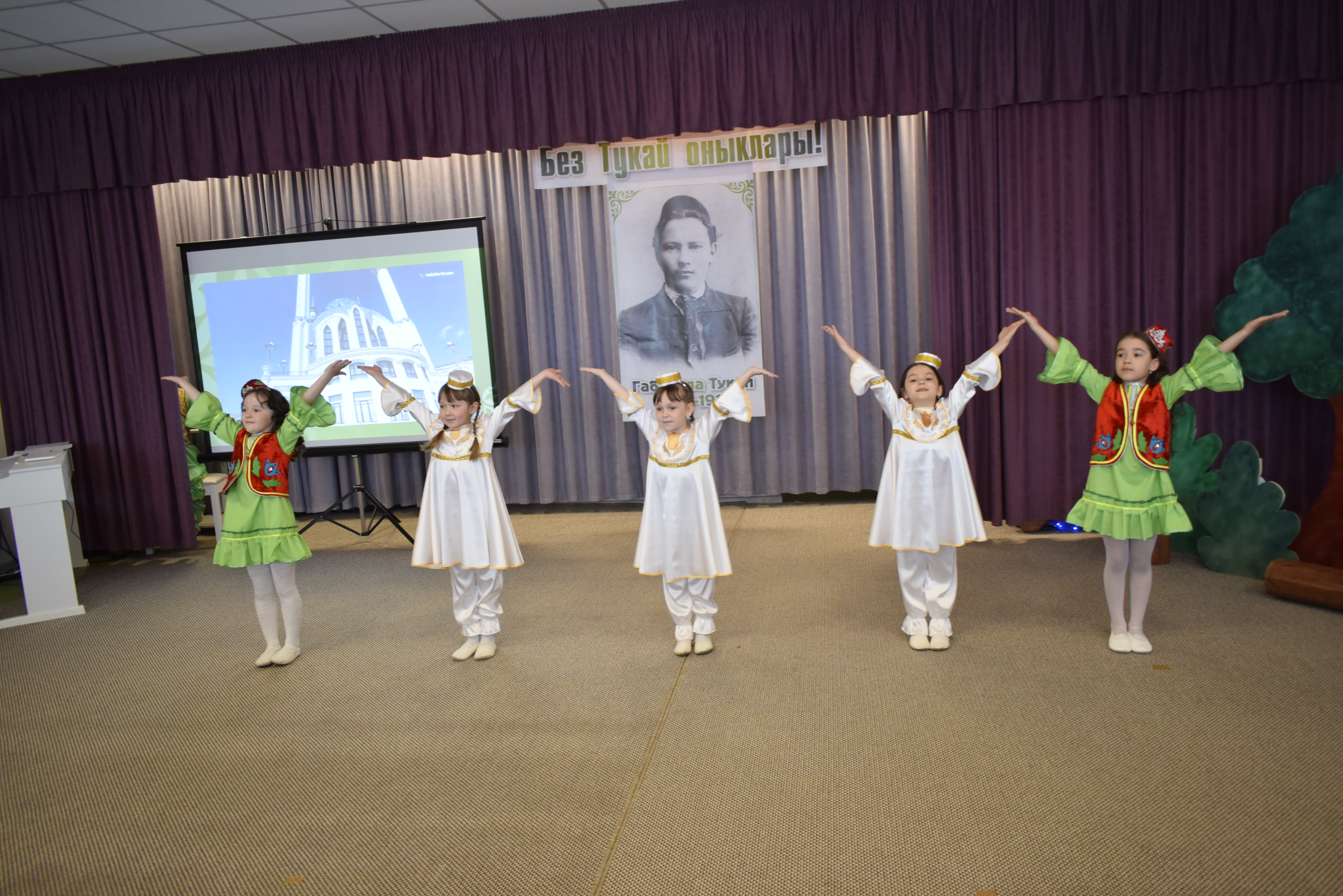 Ачык дәресләрдән соң барысы да балалар бакчасының актлар залына үтте. Стенада Габдулла Тукайның зур портреты эленгән, сәхнә декорацияләр белән бизәлгән иде. Педагоглар белән очрашуның концерт өлешен логопед Ләйсән Зәйниева матур итеп алып барды. Аудитория һәр номерны җылы кабул итте. Балалар Габдулла Тукай шигырьләрен, татар һәм рус биюләрен башкардылар, кызыклы инсценировкалар күрсәттеләр.