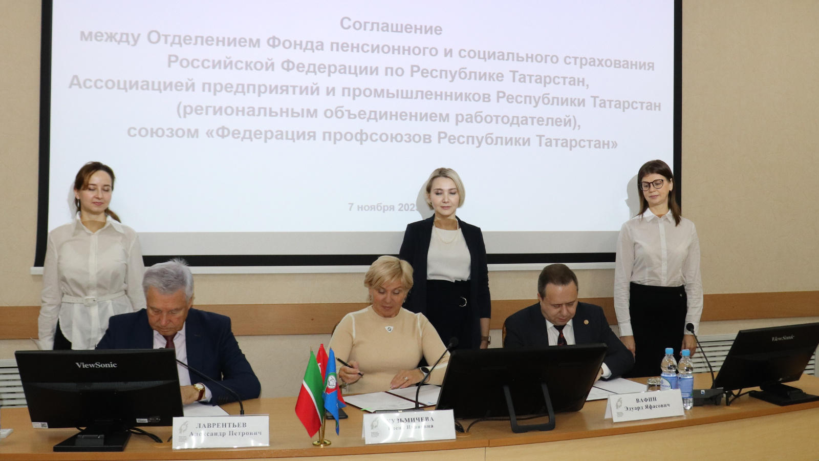 Социаль фондның Татарстан бүлеге идарәчесе Эдуард Вафин, Татарстан Республикасы Профсоюзлар федерациясе рәисе Елена Кузьмичева һәм Татарстан Республикасы предприятиеләре ассоциациясе президенты Александр Лаврентьев эшләүче гражданнарны социаль яклау системасының нәтиҗәлелеген арттыру мәсьәләләре буенча үзара хезмәттәшлек турында килешү имзаладылар.