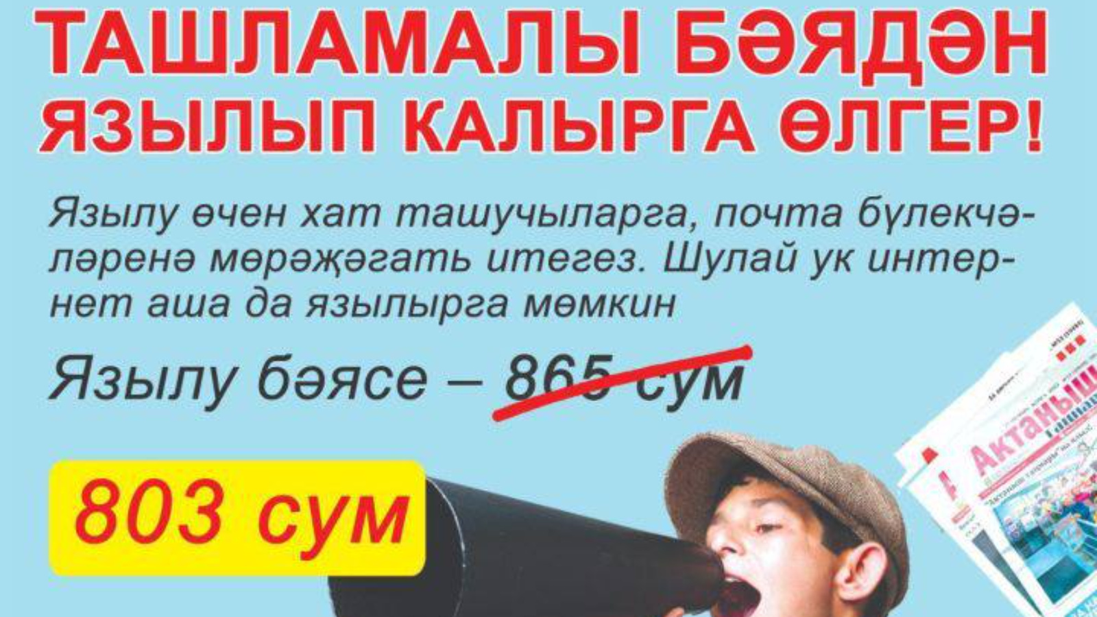 18 апрельгә кадәр сайтта һәм Россия почтасы бүлекчәләрендә вакытлы басмаларга ташлама белән 30% ка кадәр язылырга мөмкин. Нәшрият йортлары белән бергә компания 1 900 басмага язылу бәясен киметәчәк. Алар арасында - иҗтимагый-сәяси, күңел ачу һәм тар белгечлекле газета-журналлар, шул исәптән Татарстанда чыгарыла торган басмалар. Тәкъдимнән барлык почта бүлекчәләрендә, сайтта, Россия почтасы мобиль кушымтасында, шулай ук почта-касса терминаллары ярдәмендә язылу рәсмиләштергән почтальоннарда файдаланырга мөмкин. Онлайн периодикасын яздырган клиентларның исемнәре яки язылу индексы, тема, алфавит, мәнфәгатьләр буенча кирәкле басманы сайлау мөмкинлеге бар, ә рәсмиләштерү нибары берничә минут алачак.