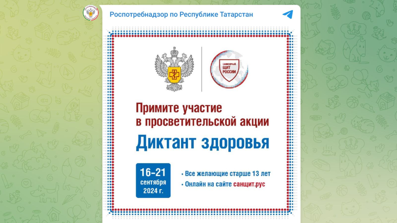 16-21 сентябрьдә «сәламәтлек диктанты»федераль белем бирү акциясе узачак. Чараның максаты-санитария-гигиена грамоталылыгын һәм сәламәт яшәү рәвеше нормаларын популярлаштыру