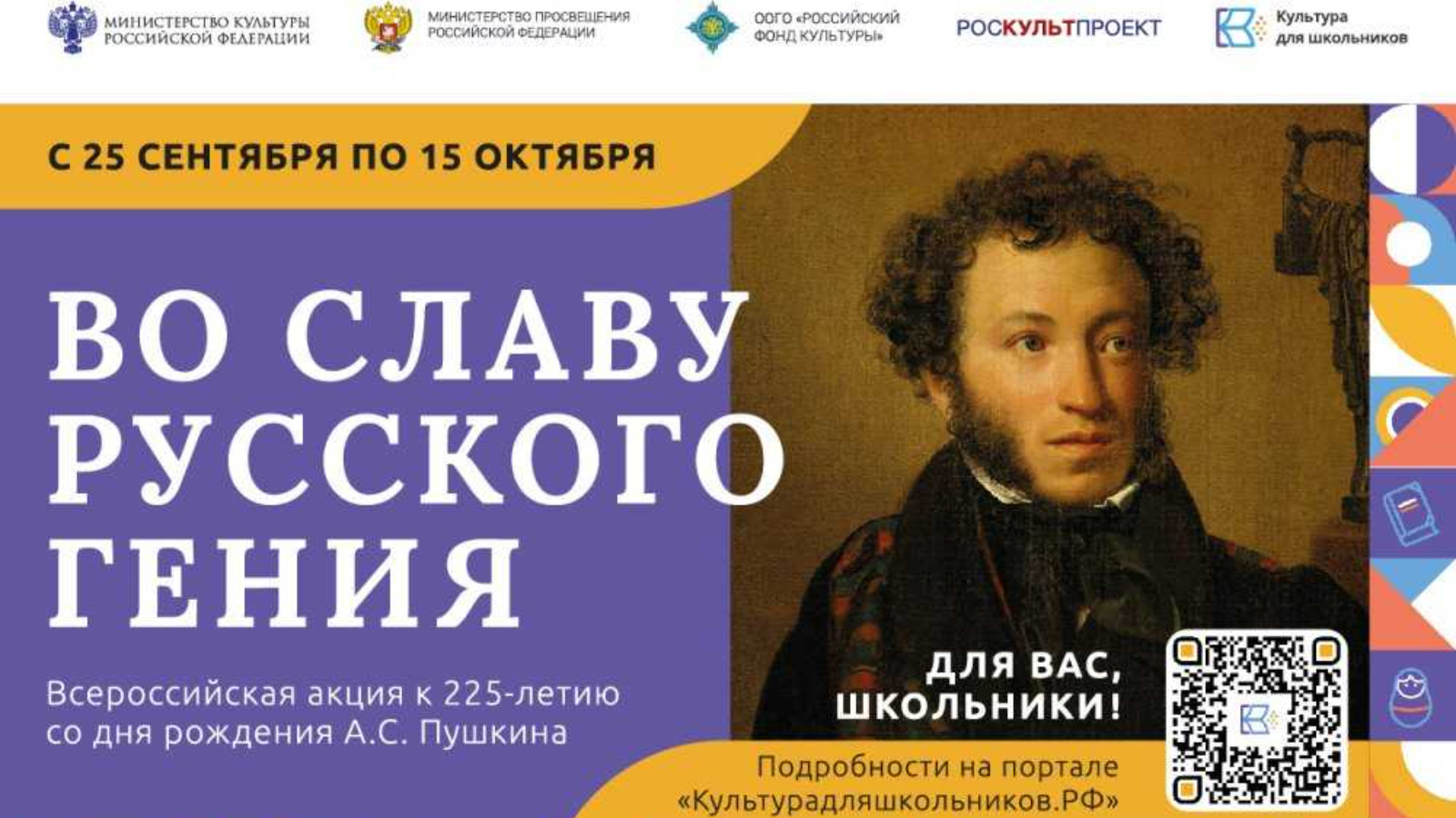 25 сентябрьдән 15 октябрьгә кадәр «мәктәп укучылары өчен Мәдәният» ведомствоара мәдәни-мәгариф проекты кысаларында рус әдәбияты классигы Александр Пушкинның тууына 225 ел тулуга багышланган «рус даһилыгы даны өчен» Бөтенроссия акциясе узачак. Татарстан мәктәп укучыларын Иҗади ярышларга кушылырга чакыралар. Бөтен Россиядән килгән укучылар номинацияләрдә әдәби, артистик һәм сәнгати сәләтләрен күрсәтә алалар: - "Пушкин һәм театр "(шагыйрь әсәрләре буенча театр куелышы), - »Пушкин укулары " (Пушкин әсәрләрен уку), - »И в новом веке Пушкин с нами " (шагыйрьгә һәм аның иҗади мирасына багышланган үз әсәре), - »Пушкин в живописи " (Пушкин портреты яки аның бер әсәренә иллюстрация). Теләүчеләргә тәкъдим ителгән номинацияләрнең берсендә яки берничәсендә эш әзерләргә һәм катнашуга гаризаларын «Культурадляшкольников.РФ» Порталында калдырырга кирәк. акция нәтиҗәләре буенча танылган әдәби һәм театр эшлеклеләреннән торган эксперт комиссиясе иң кызыклы 50 эшне сайлап алачак, алар «Культурадляшкольников.РФ» сайтында бастырылачак. «мәктәп укучылары өчен Мәдәният» проекты РФ Мәдәният министрлыгы тарафыннан гамәлгә ашырыла.РФ Мәгариф министрлыгы мәдәни стратегияләр һәм проект идарәсе үзәге (роскультпроект) һәм Россия Мәдәният Фонды белән берлектә.