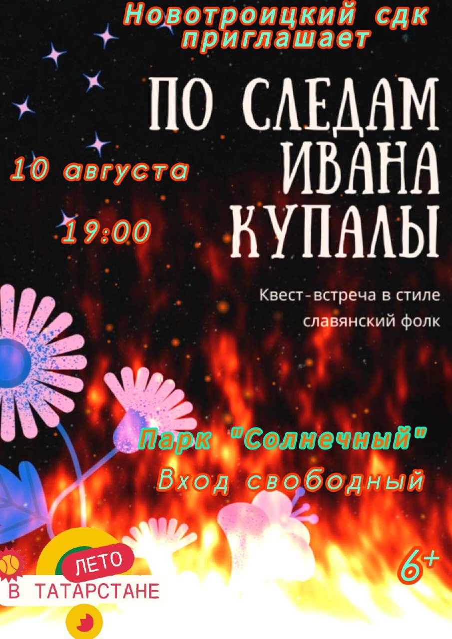 10 августта 19:00 сәгатьтә Новотроицкое авылында, "Кояшлы" паркында "Татарстанда җәй" проекты кысаларында "Иван Купалы эзләре буенча" квест-очрашуы узачак.