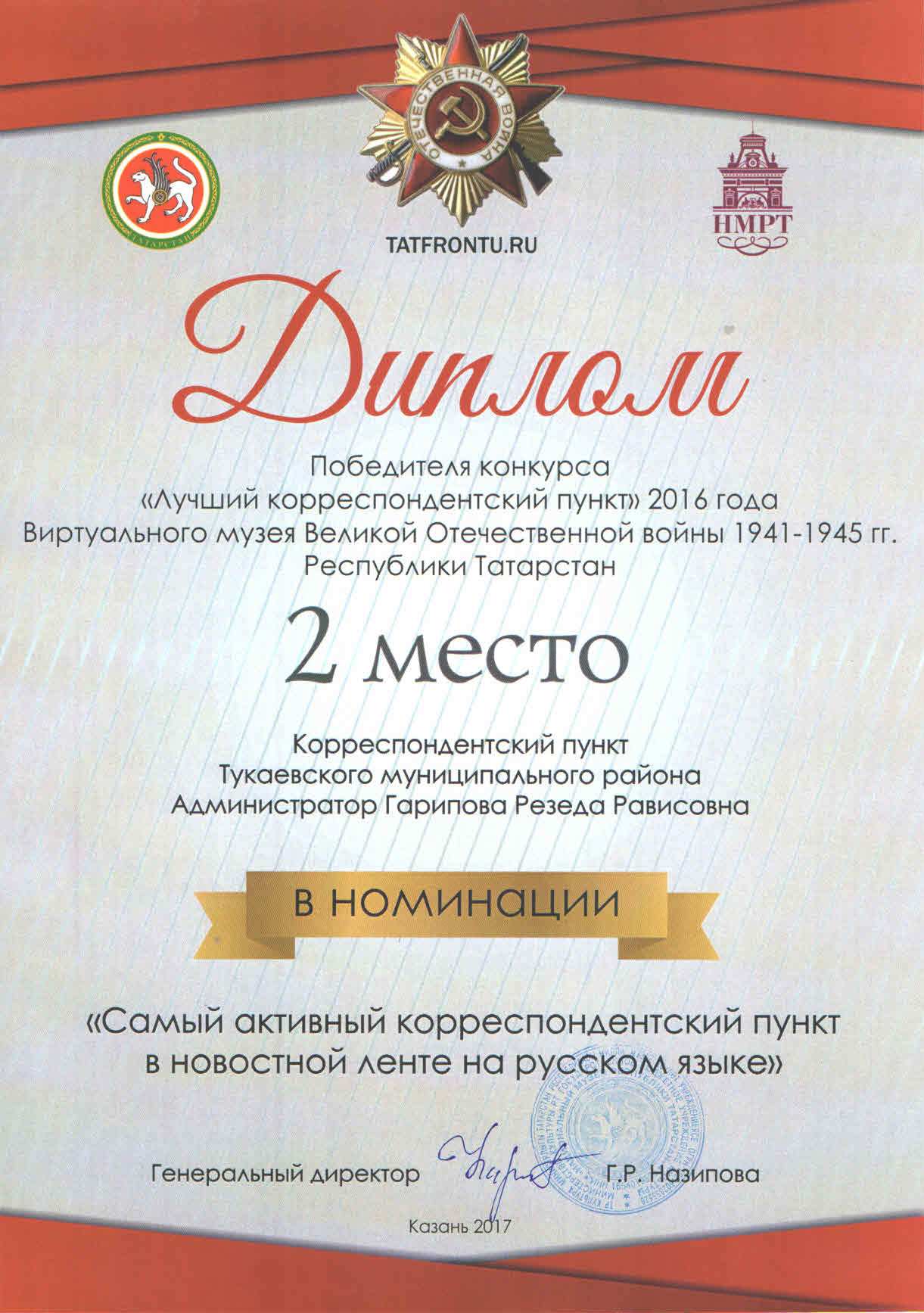 Тукай районы Бөек Ватан сугышына багышланган Виртуаль музей Корреспондент пункты республикакүләм үткәрелгән бәйгедә «Самый активный корреспондентский пункт в новостной ленте на русском языке» дигән номинациядә 2 нче урынга ия булды. Котлыйбыз!По результатам работы Виртуального музея Великой Отечественной войны в 1941-1945 г.г. за 2016 год Корреспондентский пункт Тукаевского муниципального района под руководством Гариповой Резеды Рависовны награждён дипломом за 2 место в номинации «Самый активный корреспондентский пункт в новостной ленте на русском языке» и награжден ценным подарком.